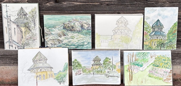 前夜の雨も上がり、暑くもなく寒くもない絶好のスケッチ日和。会員10名岡山駅に早朝集合しバスに乗り込みました。 車中お喋りが弾みあっという間に湯郷到着。 秋空の下温泉郷を散策する人、吉野川河原で水面を描く人、鷺温泉館周辺で建物をスケッチする人、温泉に入る人、カフェを楽しむ人、思い思いの時を過ごしてバス停に再集結。 バス停に居合わせたご婦人方も交えてミニ合評会をして帰途に着きました。 小正寿司さんでのランチ懇親も盛り上がり、終始和気あいあい楽しい親睦バス旅行となりました。 岡山から片道1時間半で気軽に出かけられる湯郷の魅力を再発見した1日でもありました。 文と絵 最所養子 |