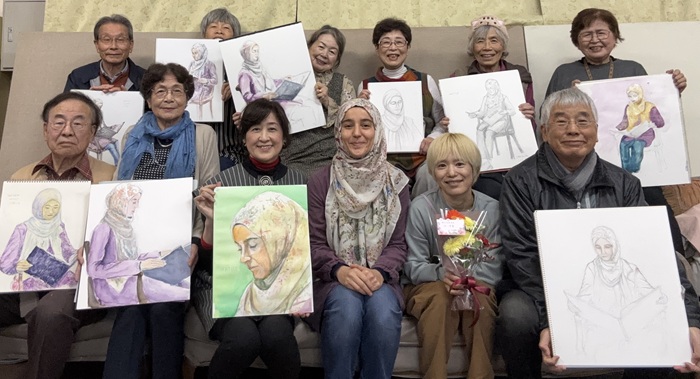 11月9日チャーチル会岡山の例会が開かれ会員10人が参加して池上わかな先生のご指導の元、美しいトルコ人のハティジェさんをスケッチしました。 ハティジェさんは岡山大学で薬学を専攻するインテリ女性で大変に朗らかな方でした。 また池上わかな先生の日展会員賞受賞をお祝いして会員一同より花束と金一封を贈呈しました。 おめでとうございます。 今後ますますのご活躍を期待しております。 文と絵 高橋聖之 |